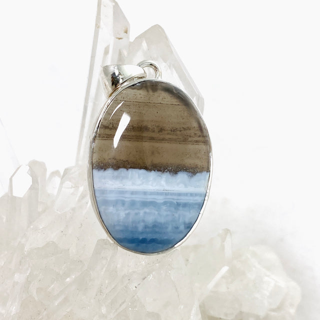 Crafted in sterling silver, this Blue Owyhee cabochon pendant helps ease anxiety and stress. The calming energy of the stone supports peaceful communication and self-expression.