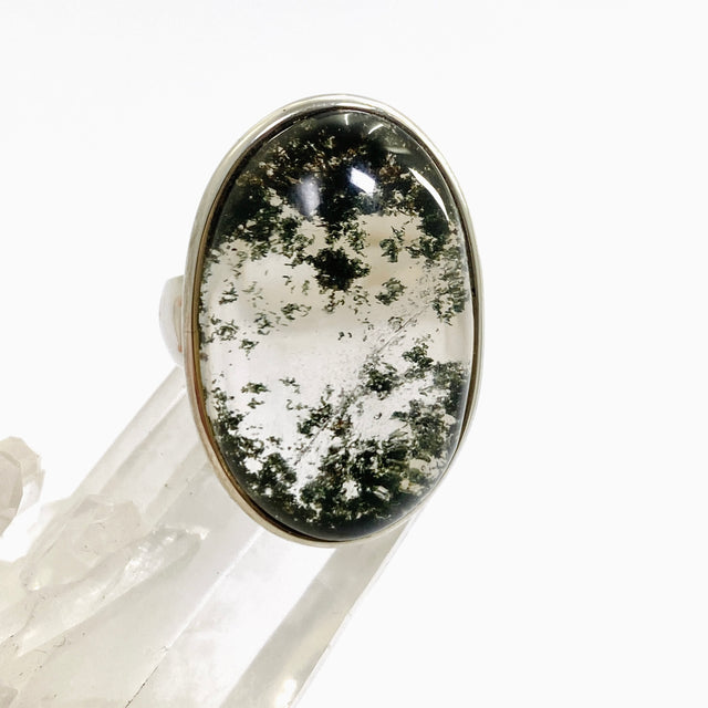 This sterling silver ring features Chlorite inclusions within Quartz, forming soft, natural landscapes within the stone. Chlorite in Quartz is highly valued for its gentle cleansing and healing energies, often used to support deep emotional renewal and spiritual growth. A beautiful choice for anyone seeking inner harmony.
