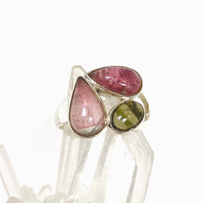 Adorn your finger with this elegant tourmaline ring showcasing three distinct colours. The pink tourmaline fosters compassion and emotional healing, while the green tourmaline promotes abundance and growth, making this ring a beautiful blend of energies for everyday wear.
