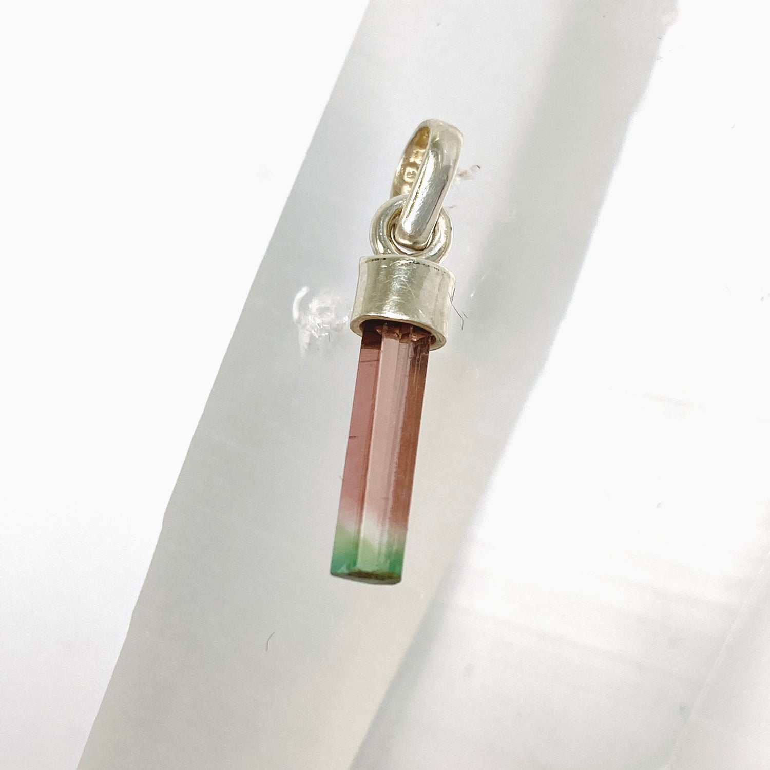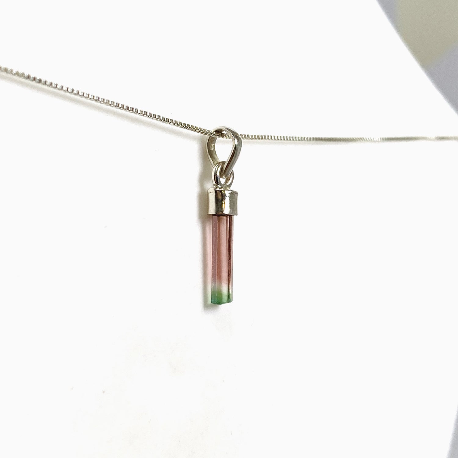 A raw Watermelon Tourmaline pendant displaying its natural pink and green shades. Set in .925 sterling silver, the simple setting supports the crystal while allowing its textures and energy of balance and emotional clarity to take centre stage.